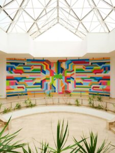 À travers cette intervention monumentale, commission de Bank Al Maghirb, l’espace devient une œuvre à ciel ouvert, une invitation à ralentir, observer et ressentir l’énergie positive que l’artiste souhaite insuffler à ce lieu et aux